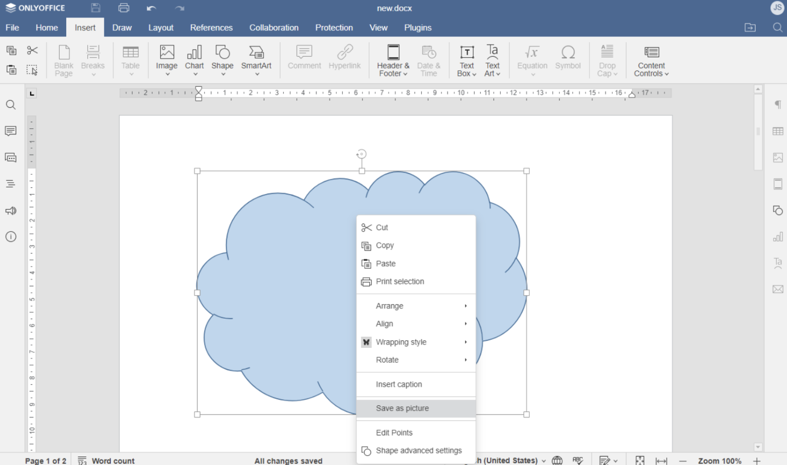 La nuova versione degli editor online ti permette di salvare forme, grafici, Text Art, oggetti Smart Art, caselle di testo e così via creati nei tuoi documenti di testo, fogli di calcolo o presentazioni come file PNG con uno sfondo trasparente. Prossimamente puoi utilizzarli come immagini.