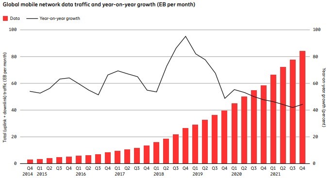 La crescita degli abbonamenti alla banda larga mobile e il sempre maggiore consumo di video, porta anche ad un aumento del traffico dati da mobile che è cresciuto del 44% tra il quarto trimestre 2020 e lo stesso periodo del 2021, per raggiungere gli 80 Exabyte (EB). La crescita trimestrale è stata invece dell’8% circa.