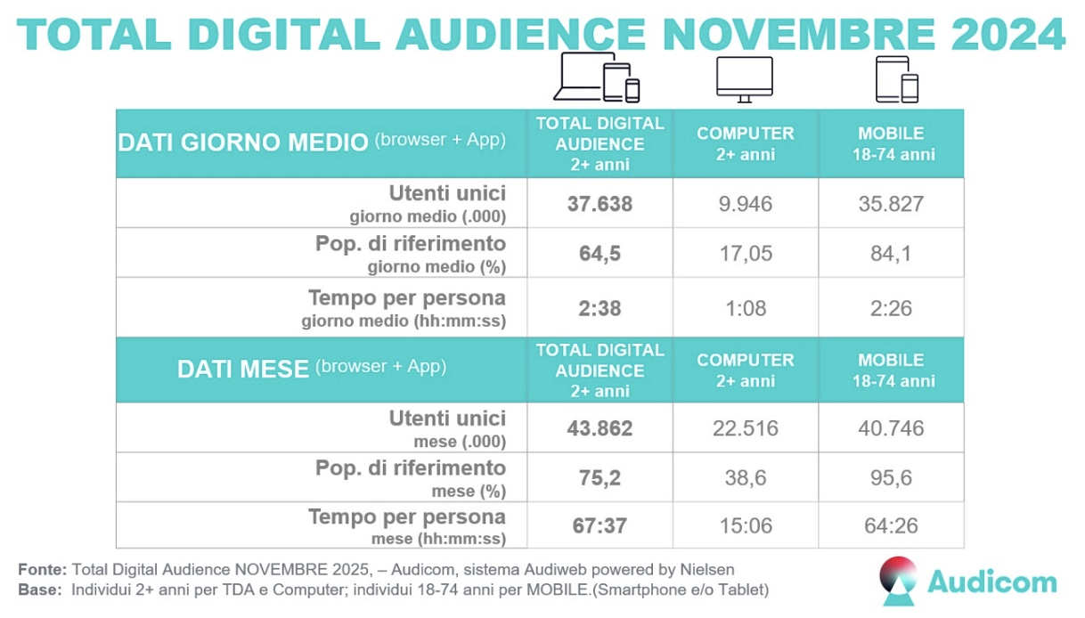 L’audience online nel mese di novembre 2025 ha raggiunto 43,9 milioni di individui dai 2 anni in su, collegati dai dispositivi rilevati (Computer e Mobile) per 67 ore e 37 minuti complessive.