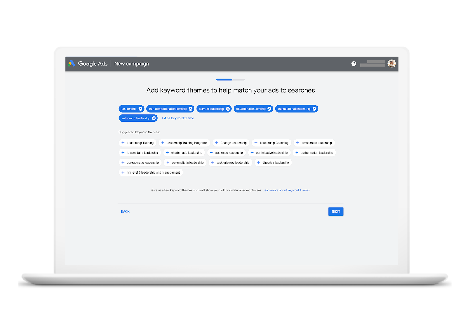 Abbiamo notato che le piccole imprese vorrebbero più controllo sulle parole chiave che le aiutano a raggiungere potenziali clienti su Ricerca Google. Con i temi delle parole chiave (precedentemente “prodotti e servizi”) potete comunicarci che cosa offre la vostra impresa e noi mostreremo le vostre inserzioni ai potenziali clienti che ricercano frasi correlate. Questo significa che le vostre inserzioni potranno raggiungere più persone e voi potrete risparmiare tempo nel processo. Avrete anche la possibilità di modificare o eliminare i temi delle parole chiave, per averne sempre il controllo.