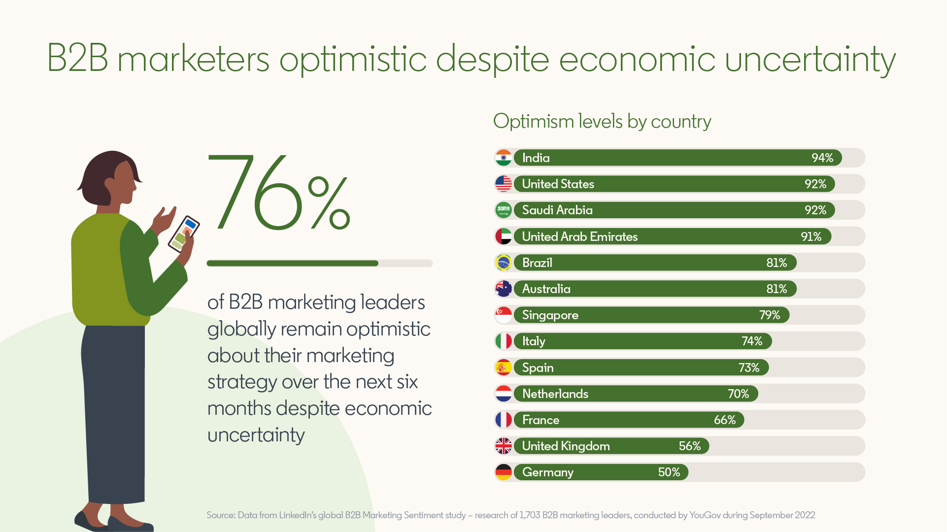 Lo studio globale B2B Marketer Sentiment di LinkedIn, che ha coinvolto oltre 1.700 marketing leader B2B di tutto il mondo, ha rilevato che lo scenario di ottimismo non è omogeneo: in Europa, il 74% dei marketer italiani si sente positivi rispetto ai loro piani, seguiti dal 56% del Regno Unito e dal 50% di quelli in Germania. Dando invece uno sguardo a livello globale, osserviamo che i marketer B2B in India sono i più ottimisti riguardo alle loro strategie (94%), seguiti dall’Arabia Saudita (92%) e dagli Stati Uniti (91%).