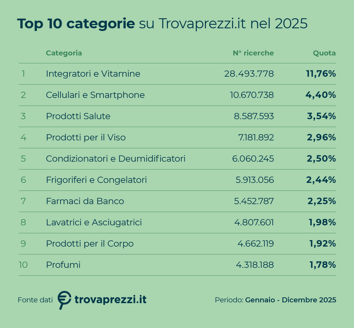 Il dato più rilevante del 2025 è il perdurante dominio della salute sulla tecnologia. Integratori e Vitamine si conferma la categoria più cercata con 28,5 milioni di ricerche, in forte crescita (+17,5%) rispetto al 2024. Un segnale chiaro: il benessere non è più episodico, ma una voce strutturale nel carrello digitale degli italiani.