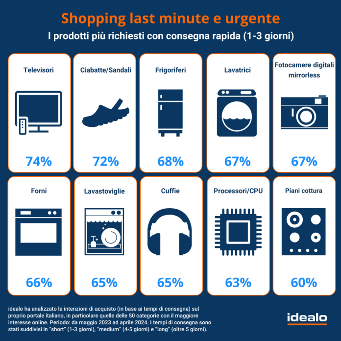 Analizzando il comportamento degli utenti negli ultimi dodici mesi, idealo segnala che l’urgenza è un fattore determinante in grado di condizionare l’interesse all’acquisto di determinati articoli: nel dettaglio, prendendo in considerazione i click registrati sulle offerte “short” – che prevedono la consegna entro massimo 3 giorni – spiccano sul podio degli articoli più ricercati televisori, sandali e frigoriferi con rispettivamente il 74%, 72% e 68% delle intenzioni di acquisto.