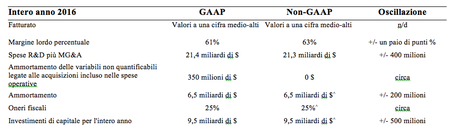 Le previsioni finanziarie Intel non tengono conto del potenziale impatto di eventuali alleanze aziendali, acquisizioni di asset, disinvestimenti, investimenti strategici e altre transazioni significative che potrebbero essere completati dopo il 14 gennaio. Queste previsioni includono i risultati previsti dell’acquisizione di Altera completata di recente, una settimana aggiuntiva nel primo trimestre dovuta al fatto che il 2016 risulta un anno di 53 settimane e una variazione della durata stimata dei macchinari e delle attrezzature nelle nostre fabbriche da 4 a 5 anni.