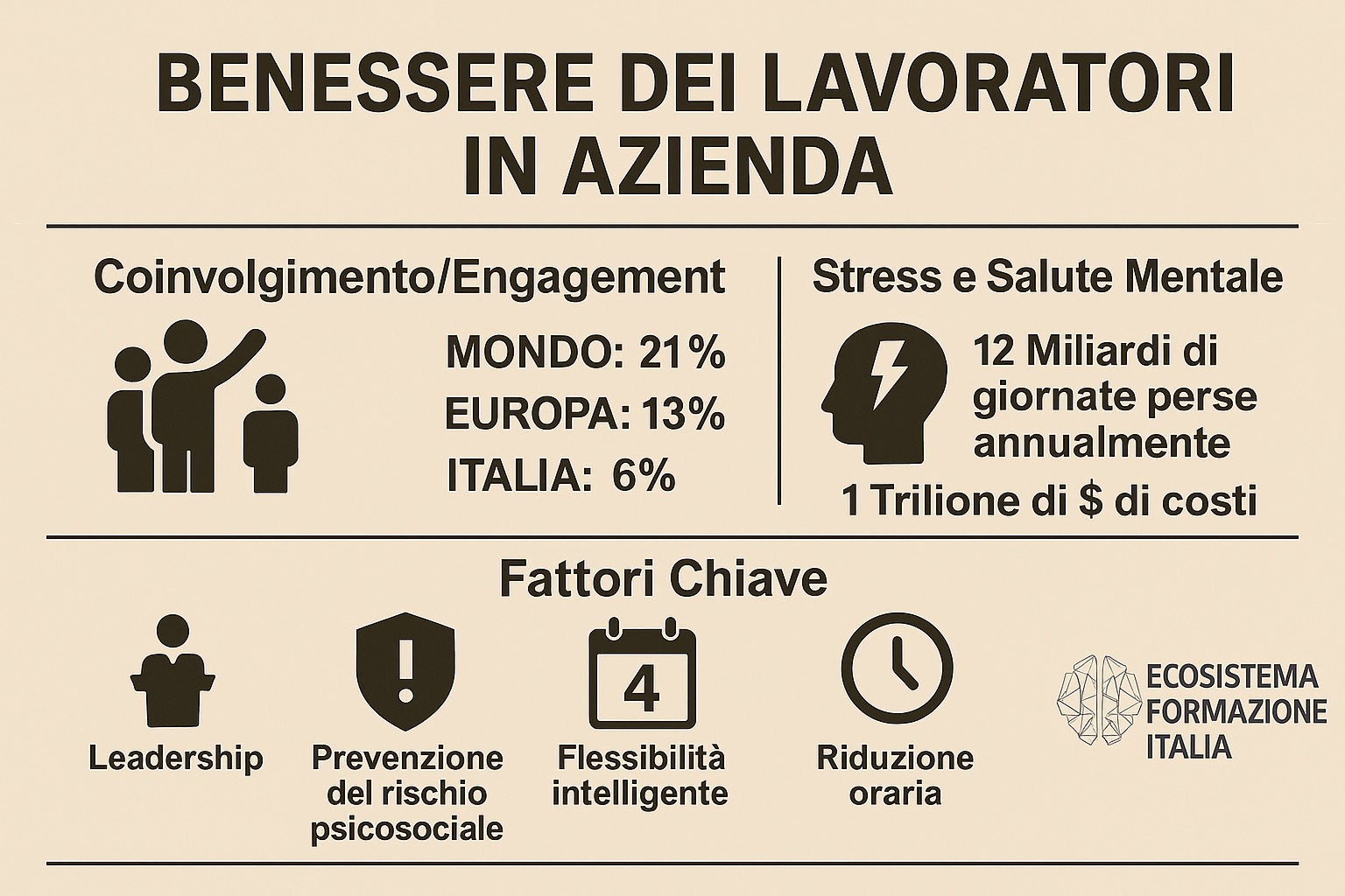 Le imprese che investono in engagement, salute mentale e qualità del lavoro registrano, secondo McKinsey (2025), una produttività per ora lavorata superiore del 30% e un turn-over dimezzato. Eppure, in Italia, i numeri restano drammatici: solo il 6% dei lavoratori si dichiara pienamente motivato, contro il 13% della media europea e il 21% mondiale (Gallup, State of the Global Workplace 2024).