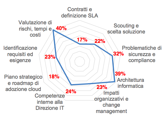 Un fenomeno questo che non coinvolge soltanto le grandi aziende ma anche le PMI. Secondo i dati dell’Osservatorio Cloud and ICT as a Service del Politecnico di Milano, se da una parte il 12% di esse si sono spinte verso il cloud solo per necessità tattiche e senza integrare i sistemi informatici interni, il 31% ha avviato un progetto strategico di informatizzazione e trasformazione digitale, ancora però limitato ad ambiti aziendali di supporto (come ad esempio la mail). Il 28% delle PMI ha scelto invece soluzioni cloud a supporto di processi core o mission critical che però non sono ancora state integrate con i sistemi informativi interni, cosa che invece ha fatto il restante 28%.