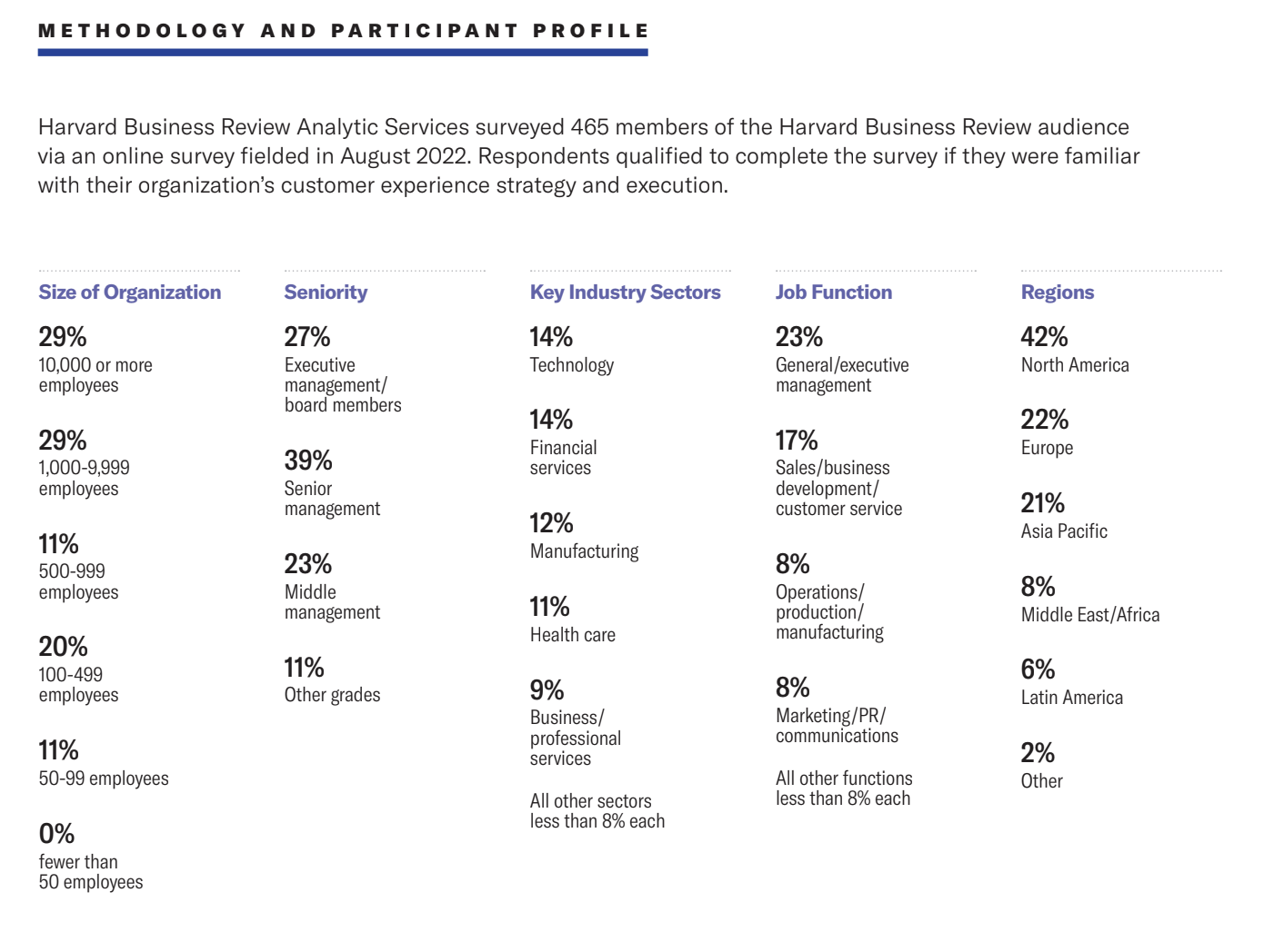 Il report è stato condotto in forma di sondaggi e interviste rivolgendosi a 465 Business Leaders che si occupano di CX all’interno dell’azienda o che sono familiari alla sua strategia situati per il 42% nel Nord America, il 22% in Europa, il 21% nell’Asia-Pacifico, l’8% nel Medio Oriente/Africa, il 6% nell’America Latina e il 2% in altri Paesi.