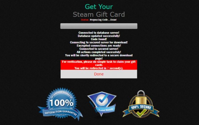 Quando l’utente è sul falso sito web, gli viene richiesto di selezionare la gift card che desidera, in modo da ricevere il codice di attivazione. Dopo questo passaggio, il meccanismo fraudolento si mette in moto. Per ottenere il codice generato dal sistema, l’utente deve dimostrare di non essere un robot e, per farlo, deve seguire il link che gli viene suggerito e completare varie attività; il numero e il tipo di attività da portare a termine sono determinate dalla rete del partner a cui l’utente viene reindirizzato. Ad esempio, all’utente potrebbe essere richiesta la compilazione di un modulo, il rilascio di un numero di telefono o di un indirizzo email, la sottoscrizione di un servizio di SMS a pagamento, l’installazione di un adware e altro ancora.