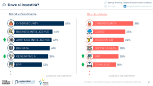 Tra le organizzazioni più strutturate, la spesa digitale si concentra come da diversi anni su sistemi di CyberSecurity (57%) e soluzioni di Business Intelligence e visualizzazione dati, ma quest’anno al terzo posto salgono le soluzioni di Artificial Intelligence, Cognitive Computing e Machine Learning, su cui investirà in modo prioritario il 43% delle aziende, in grande crescita proprio come quelle di Generative AI, al quinto posto con il 39%. Tra le PMI, al primo posto c’è la Cybersecurity (31%), poi la migrazione e gestione Cloud (25%), le applicazioni e tecnologie di Industria 4.0 (24%).