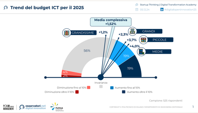 Le aziende italiane confermano alla grande gli investimenti nel digitale, ritenuto essenziale per mantenere competitività. Nonostante le ristrettezze e incertezze attuali, il 2025 prevede un aumento dell’1,5% dei budget in ICT delle imprese, in linea con il trend degli ultimi nove anni, seppur con un tasso di crescita leggermente inferiore rispetto al 2023 (+1,9%). Alla crescita contribuiscono in particolare le piccole (+3,7%) e medie imprese (+4%), mentre sono più stabili le grandi.
