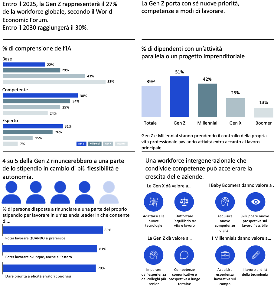 Un’attenzione crescente dei business leader, e dell’Index di quest’anno, è rivolta all’impatto immediato dei giovani professionisti. Gen Z e Millennial, ormai maggioranza della workforce a livello globale, stanno ridefinendo il mondo del lavoro con nuove aspettative.