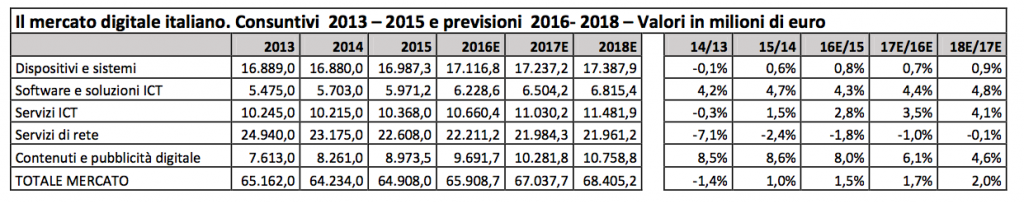 Fortunatamente però, qualcosa sembra muoversi: secondo le stime di Assinform, Confindustria Digitale e NetConsulting, dopo un 2015 in crescita dell’1%, il mercato digitale mostrerà un ulteriore miglioramento in questo 2016: giro d’affari di 65.908 milioni di euro, con un incremento dell’1,5%. Ancora più ottimistiche le stime per i due anni successivi: +1,7% nel 2017 e +2% nel 2018.