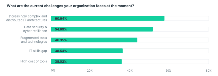 Mentre le aziende continuano ad accelerare l’adozione di servizi cloud, container e soluzioni serverless per restare competitive, i team IT soffrono una crescente pressione. Secondo il sondaggio, il 61% dei professionisti IT indica l’aumento della complessità come la sfida principale—non solo perché rende i sistemi più difficili da controllare e aumenta i rischi informatici, ma anche per via del carico di lavoro sempre più gravoso.