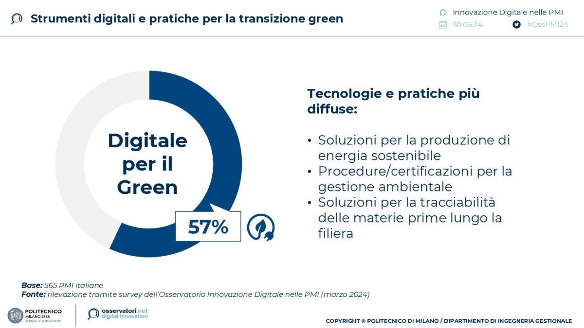 La transizione verde è strettamente legata a quella digitale, tanto che si parla di twin transition. La prima rappresenta un’opportunità per migliorare l’impatto ambientale delle tecnologie digitali e, al tempo stesso, queste ultime possono costituire un fattore abilitante per la transizione verde, per esempio fornendo alle imprese strumenti per monitorare i consumi energetici o tracciare le materie prime. A oggi, la piccola e media impresa italiana crede nel tema della twin transition: il 57% di queste imprese impiega già strumenti digitali che consentono di perseguire obiettivi di sostenibilità ambientale.