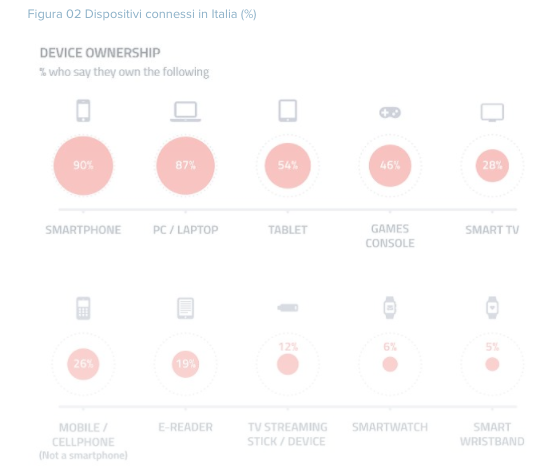 E in Italia? Il panel intervistato dal Global Web Index [Figura 02], appare ancora più tecnologico, per quanto riguarda il possesso di oggetti mainstream dotati di connessione Internet, rispetto al corrispettivo statunitense. Il tasso di penetrazione degli smartphone raggiunge addirittura il 90%, il possesso di tablet è superiore di quattro punti percentuali, ma anche console per videogiochi connesse (46%) e smart tv (28%) sembrano essere più diffuse, anche se di pochi punti percentuali, nel nostro Paese. Da notare, invece la totale mancanza di altri dispositivi connessi meno diffusi, dalla smart car alla smart home.