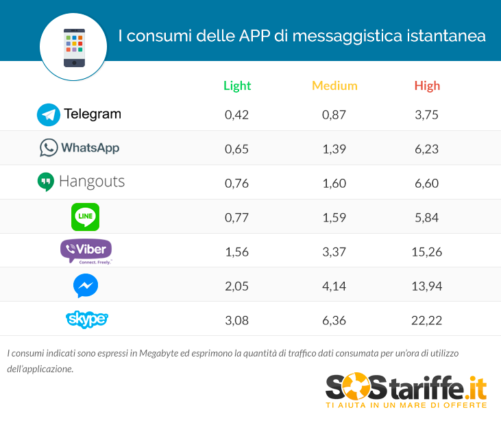 Come si nota dalle rilevazioni di SosTariffe.it la sola app di messaggistica che risulta essere meno dispendiosa, dal punto di vista del traffico dati, è Telegram. Questa applicazione, infatti, consuma dal 35% al 40% in meno rispetto a WhatsApp consumando da 0,42 MB a 3,75 MB per 1 ora di utilizzo.