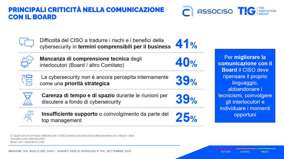 Il reperimento di personale qualificato rappresenta oggi la difficoltà più sentita dalla figura del Responsabile Cybersecurity, indicata dal 57% dei rispondenti. Seguono la difficoltà di far comprendere il valore della cybersecurity (39%) e la scarsa valorizzazione del ruolo all’interno dell’organizzazione (38%). Solo al quarto posto, rispetto al passato, si colloca la mancanza di fondi adeguati (36%), segno di una maggiore attenzione al tema. Tra le richieste ricorrenti per lavorare meglio, i CISO indicano appunto la necessità di ampliare e strutturare il team di sicurezza, ottenere maggior supporto dal top management, avere chiarezza su ruoli e responsabilità, budget adeguati e strumenti di automazione per ridurre il carico operativo. Rilevante anche la domanda di una maggiore integrazione con le altre funzioni aziendali. La comunicazione con il CdA è importante, ma comporta molte sfide (come mostra la figura successiva).