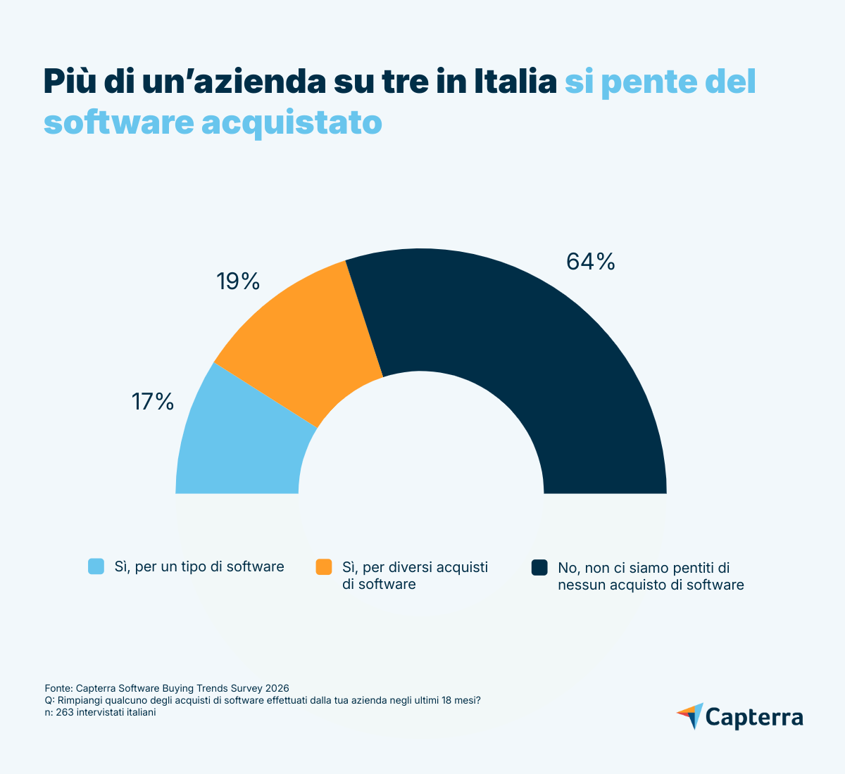 Lo studio Software Buying Trends 2026 di Capterra rivela un panorama complesso per le piccole e medie imprese: sebbene la scelta del software giusto sia cruciale per l’efficienza e la crescita, il processo decisionale è rischioso e pieno di insidie. A livello globale, il 40% degli acquirenti dichiara di aver provato delusione per almeno un acquisto software negli ultimi 18 mesi. In Italia, il rischio è leggermente inferiore, suggerendo un approccio più cauto, ma resta significativo: più di un quarto degli acquirenti italiani si dichiara deluso dal proprio investimento software. La delusione non è casuale, è quasi sempre preceduta da problemi durante la fase di implementazione. Infatti, l’81% degli italiani che ha riscontrato imprevisti in questa fase ha poi provato rammarico per la scelta fatta.