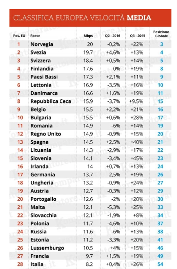 La classifica della velocità media globale , analizzata da Komparatore.it, lascia maggiore spazio alle nazioni europee: i primi due posti sono occupati da Sud Corea ed Hong Kong, ma già al terzo posto troviamo la Norvegia, seguita da Svezia e Svizzera rispettivamente in quarta e quinta posizione, poi Finlandia, Paesi Bassi e Lettonia all’8°, 9° e 10° posto. Le velocità medie riportate dalle nazioni europee, con valori compresi fra i 20 Mbps della Norvegia ed i 16,9 Mbps della Lettonia, non si discostano molto dal valore massimo di Sud Corea ed Hong Kong, pari rispettivamente a 26,3 Mbps e 20,1 Mbps.