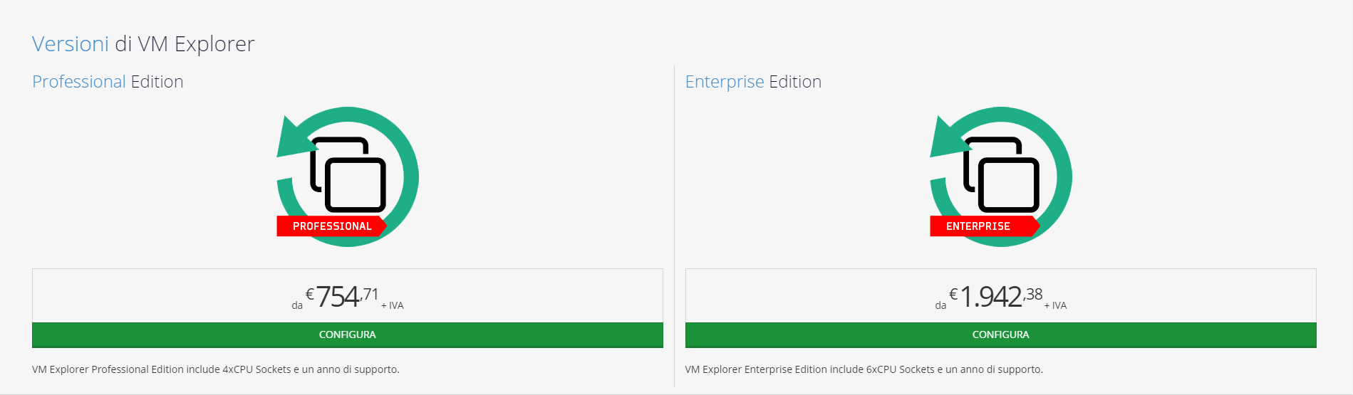 Con una licenza VM Explorer Professional si coprono 4 socket* e nessun limite sul numero delle VM gestibili a soli 754 euro. *(ovvero 4 server con un processore o 2 server con 2 processori l’uno)