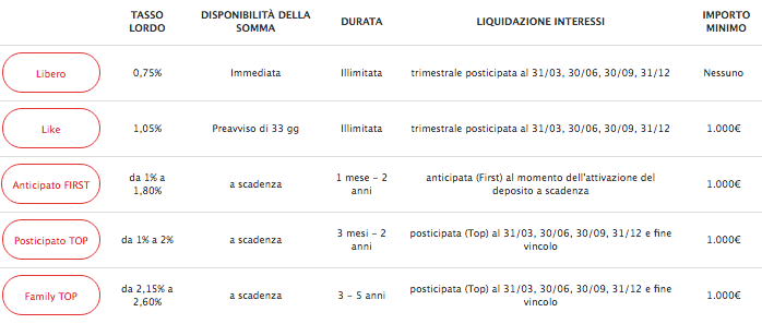 - rendimax Libero, con un rendimento dello 0,75% lordo che matura giornalmente e accreditato con cadenza trimestrale posticipata, è ideale per chi movimenta spesso il denaro o per chi può avere necessità immediata delle somme depositate;