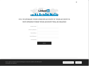 - LinkedIn – Esempio di furto di account. Nel secondo trimestre del 2022, CRP ha osservato un’e-mail di phishing che utilizzava LinkedIn. L’e-mail è stata inviata da un indirizzo di posta elettronica web e sfruttata in modo da sembrare inviata da “LinkedIn Security (mlayanac@armada.mil[.]ec)”. L’e-mail conteneva l’oggetto “Avviso di LinkedIn!!!” e il contenuto cercava di invogliare la vittima a cliccare su un link malevolo con il pretesto di aggiornare la versione del proprio account LinkedIn. Il clic porta al link “https://lin882[.]webnode[.]page/”, dove la vittima deve inserire i dati del proprio account LinkedIn.