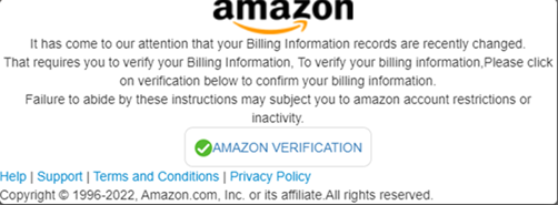 - Amazon – Esempio di furto di informazioni di fatturazione. In questa e-mail di phishing, si verifica un tentativo di furto dati di fatturazione di un utente. L’e-mail, inviata dall’indirizzo e-mail “Amazon (fcarvache@puertoesmeraldas[.]gob[.]ec)”, conteneva l’oggetto “Verifica del tuo account Amazon”. Il titolo dell’e-mail e il suo contenuto sono un tentativo di invogliare la vittima a cliccare il link malevolo “https://main.d1eoejahlrcxb.amplifyapp[.]com”, che reindirizza l’utente a una pagina fraudolenta, la quale chiede di inserire i dati di fatturazione.