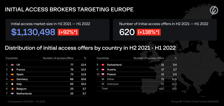 In linea con il trend di crimini hi-tech globale, il prezzo totale degli accessi a reti di aziende europee proposti su forum underground è aumentato “solo” del 92% a $1.130.498, a dispetto di incremento ben superiore del numero di accessi commercializzati. In Europa infatti tale numero è più che raddoppiato, passando da 260 nel periodo precedente a 620 tra il secondo semestre 2021 e il primo del 2022, cosa che spiega anche il crescente numero di incidenti ransomware nella regione.