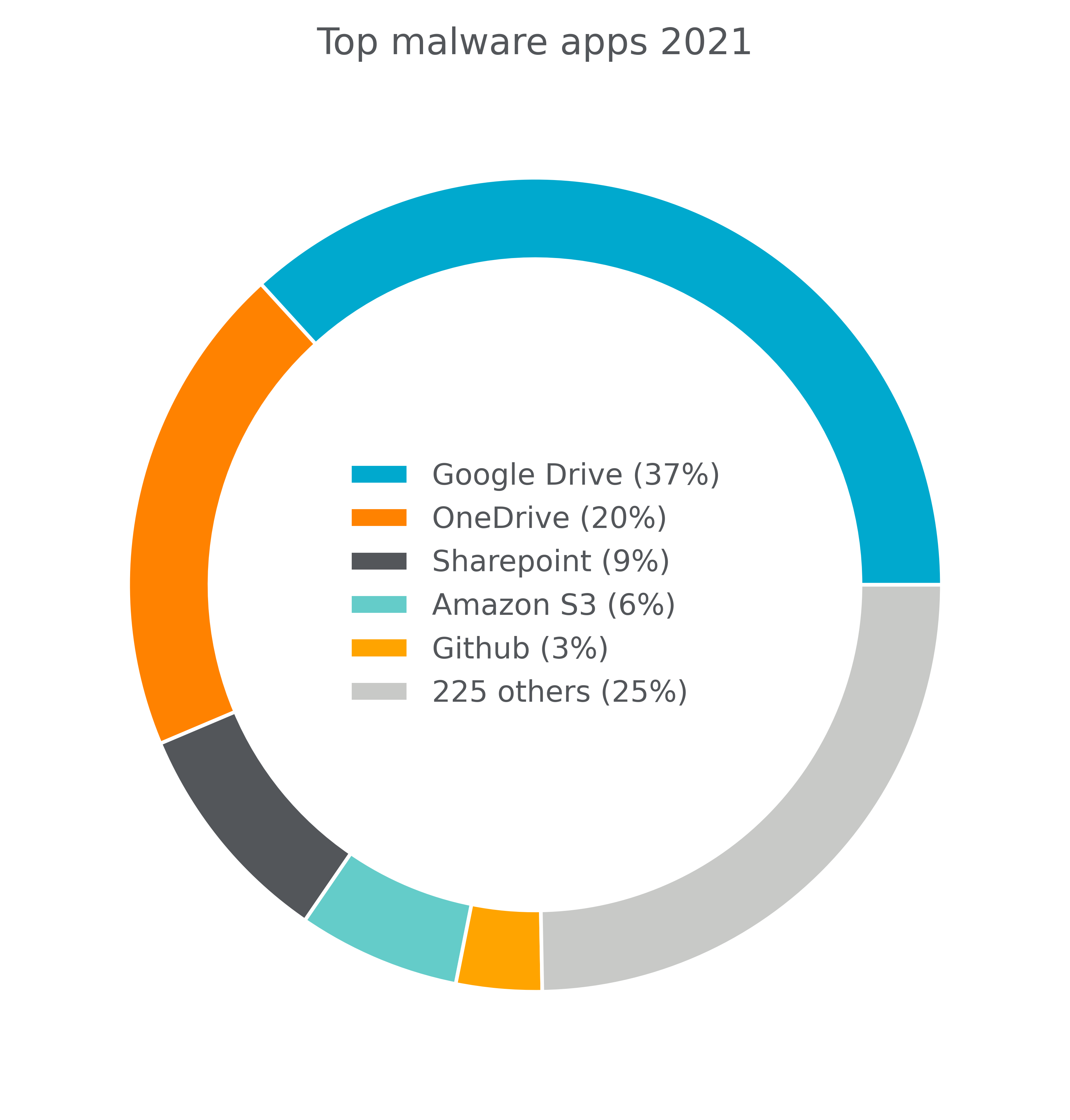 Dalla ricerca emerge che nel 2021 oltre i due terzi dei download di malware sono stati effettuati da applicazioni cloud e che Google Drive è risultata l’applicazione cloud con il maggior numero di download di malware, togliendo quindi il primato a Microsoft OneDrive.