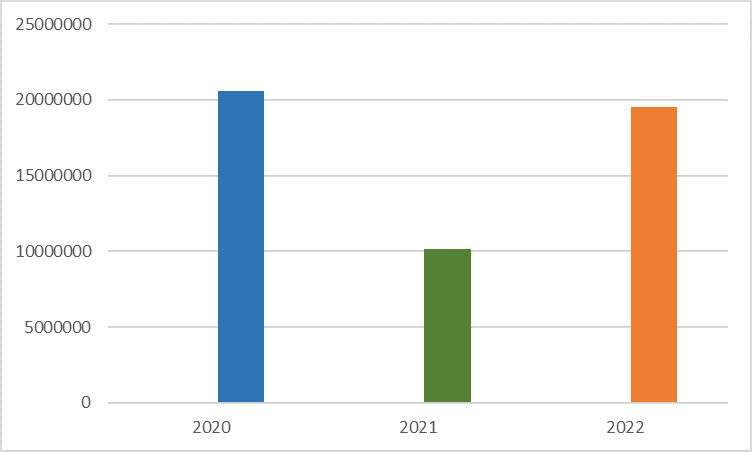 Numero complessivo di attacchi da parte di trojan bancari, 2020-2022 (gennaio-ottobre)