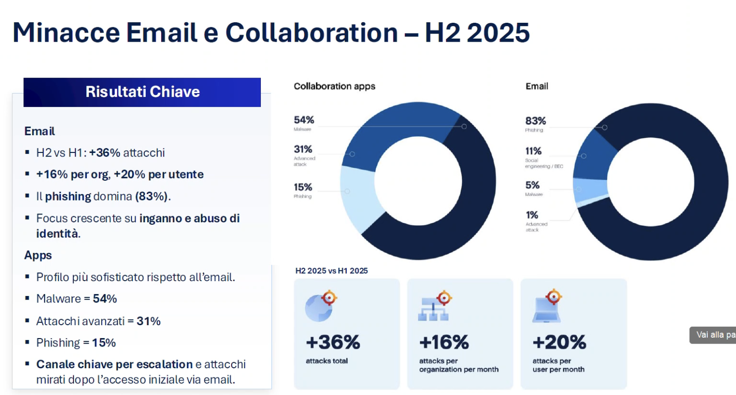 Gli attacchi email per organizzazione sono aumentati del 16%, mentre quelli diretti ai singoli utenti sono cresciuti del 20%, segno di un targeting sempre più mirato.
