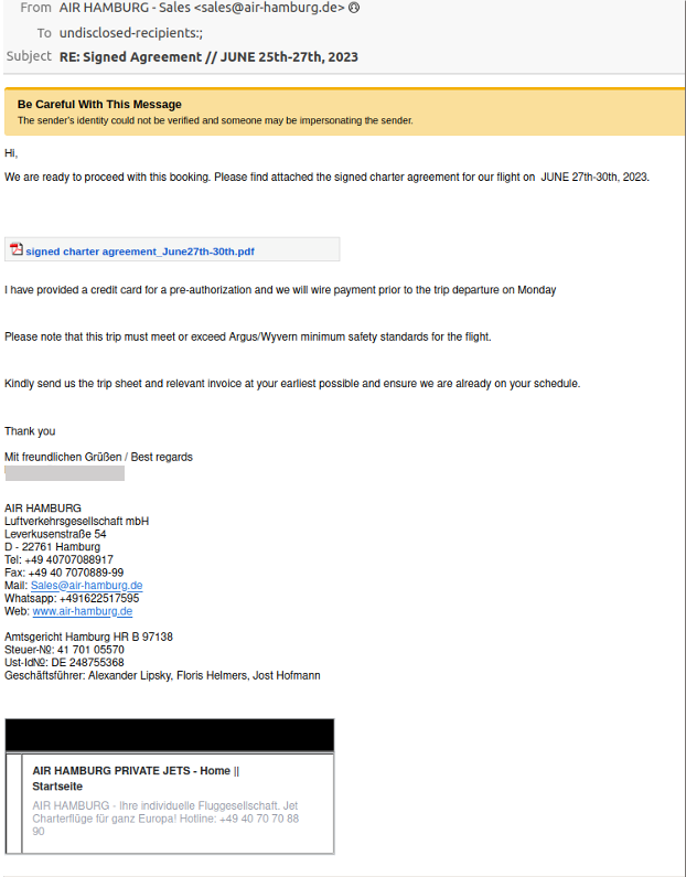 Oltre allo smishing, i cybercriminali continuano a utilizzare email di phishing costruire sulla base del social engineering per attuare truffe legate ai viaggi, come ad esempio questo messaggio contraffatto di Air Hamburg, in cui fingono di essere la compagnia aerea, contattando un cliente per procedere con una prenotazione fittizia.