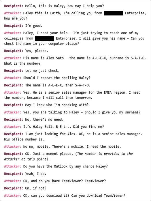 Analogamente all’episodio di cui sopra, l’aggressore ha contattato il centro di assistenza tecnica dell’azienda attraverso un numero telefonico accessibile al pubblico, chiedendo di parlare con un altro dipendente. In questo caso, l’aggressore ha condiviso una storia di copertura, coinvolgendo un’importante società di telecomunicazioni. Questa volta, ha usato un numero di telefono senza che si sapesse nulla delle segnalazioni di spam trovate online, proveniente da San Francisco. Di seguito è riportata una trascrizione parziale della chiamata. Tutti i nomi sono stati sostituiti per proteggere l’identità degli obiettivi.