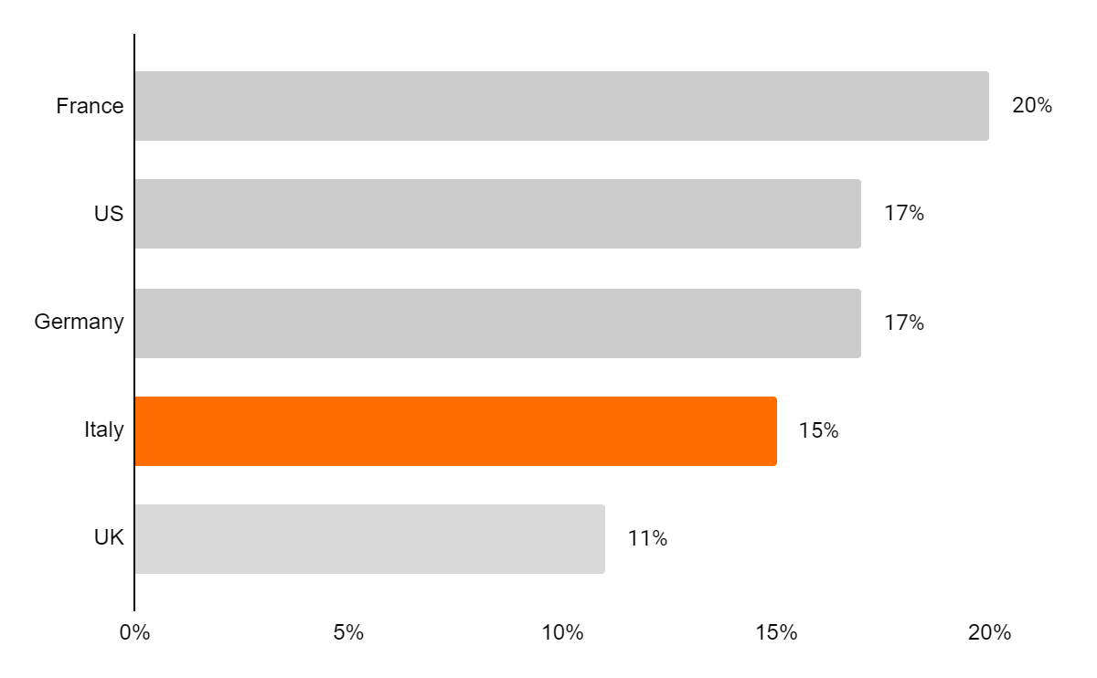 Solo il 16% di tutte le aziende intervistate sono classificate come Data Leader, il 15% in Italia. L’Italia si colloca dietro la Francia, che ha la più alta percentuale di Data Leader (20%), la Germania (17%) e gli Stati Uniti (17%).
