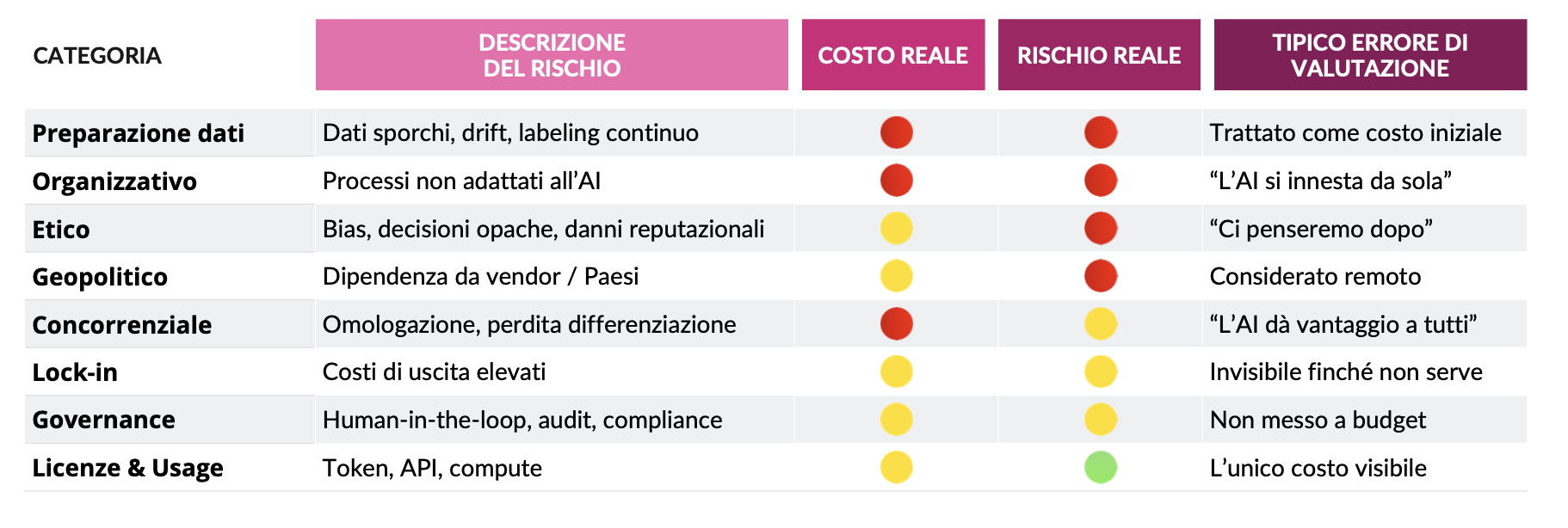 Il problema principale non è la tecnologia in sé, ma il modo in cui viene valutato il Total Cost of Ownership (TCO). Nella maggior parte dei business case, infatti, il costo dell’AI viene ridotto a voci facilmente quantificabili — cloud, GPU e licenze — trascurando componenti molto più determinanti nel lungo periodo.