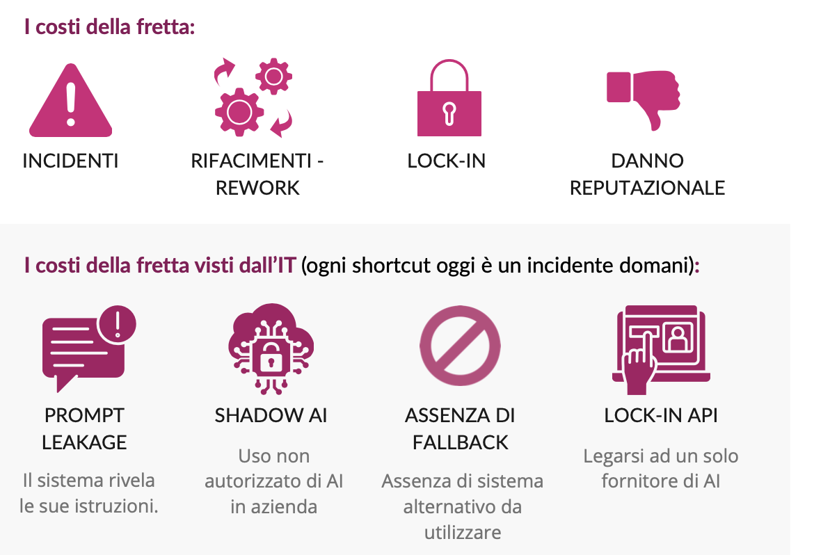 Accelerare senza controllo genera rework, incidenti, lock-in e danni reputazionali.