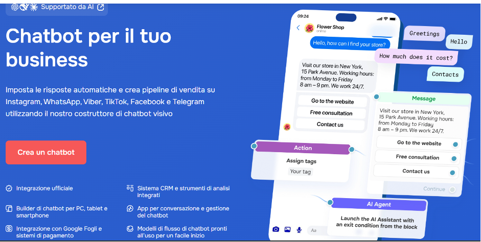 - Supporto multi-canale: un unico bot può operare su sito web, WhatsApp, Telegram, Instagram e Facebook contemporaneamente.
