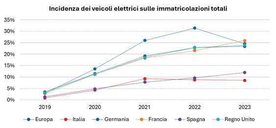 Mentre il 2023 si è chiuso con quasi un’auto elettrica su quattro immatricolate in Europa (23,4%), in ulteriore lieve aumento rispetto al 2022 (+0,5%) e in crescita anche in termini assoluti – 3 milioni di nuove auto elettriche (+16%) tra full electric (67%) e ibride plug-in – nonostante un campione come la Germania abbia segnato -6,2%, i primi otto mesi del 2024 mostrano un’inversione di tendenza: l’incidenza di nuove auto elettriche infatti è scesa a 21,2%, calo che si riscontra in tutti i principali mercati auto europei tranne il Regno Unito.