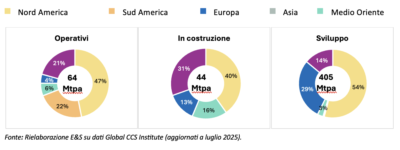 La prossimità delle scadenze associate agli obiettivi di decarbonizzazione a livello globale ed europeo ha determinato, tra 2024 e 2025, un’accelerazione dei progetti di CCUS nel mondo, passati da 408 a 489 (+19%) per 513 Mt di CO2 catturati all’anno (+23%). Si tratta ancora, per lo più, di impianti in fase di sviluppo preliminare o avanzato, e solo in numero più ridotto già operativi o in costruzione, che insieme costituiscono, nel 2025, circa il 21% della capacità di cattura annunciata (108 Mt di CO2 su 513).