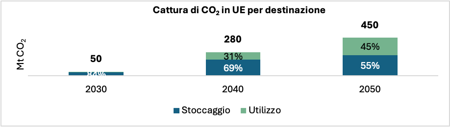 La cattura della CO2 è una soluzione imprescindibile per decarbonizzare i settori industriali hard-to-abate (tra cui, nell’industria, cemento, siderurgia, chimica, ceramica, carta e vetro). Se a livello globale si assiste a una forte crescita degli impianti (62 operativi, con una capacità di cattura complessiva di 64 Mtpa, e altri 35 in costruzione), l’Unione Europea in particolare si prepara ad assumere un ruolo sempre più rilevante, passando dai circa 50 Mt di CO2 catturati al 2030 ai 450 Mt al 2050, quota destinata per il 55% allo stoccaggio permanente.