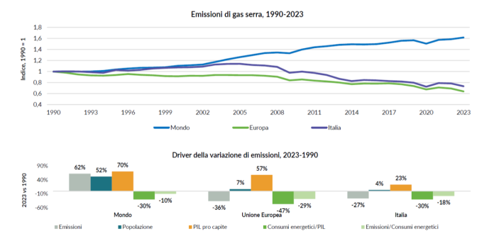Nonostante gli sforzi profusi, a livello globale la quantità di emissioni di gas serra continua ad aumentare, benché più lentamente, mentre in Europa e in Italia sono in calo dal 1990. Ma se l’Unione Europea a fine 2023 aveva registrato una diminuzione del 36%, l’Italia nello stesso periodo si è fermata a -27% e il gap è ancora più significativo considerando che contestualmente il PIL pro capite europeo è cresciuto del 57% contro il 23% del nostro Paese. Ciononostante, il percorso intrapreso verso la decarbonizzazione è quello corretto ed è frutto dell’efficientamento energetico (il rapporto consumi/PIL si è ridotto del 30%) e della diffusione delle rinnovabili (il rapporto emissioni/consumi è sceso del 18%).