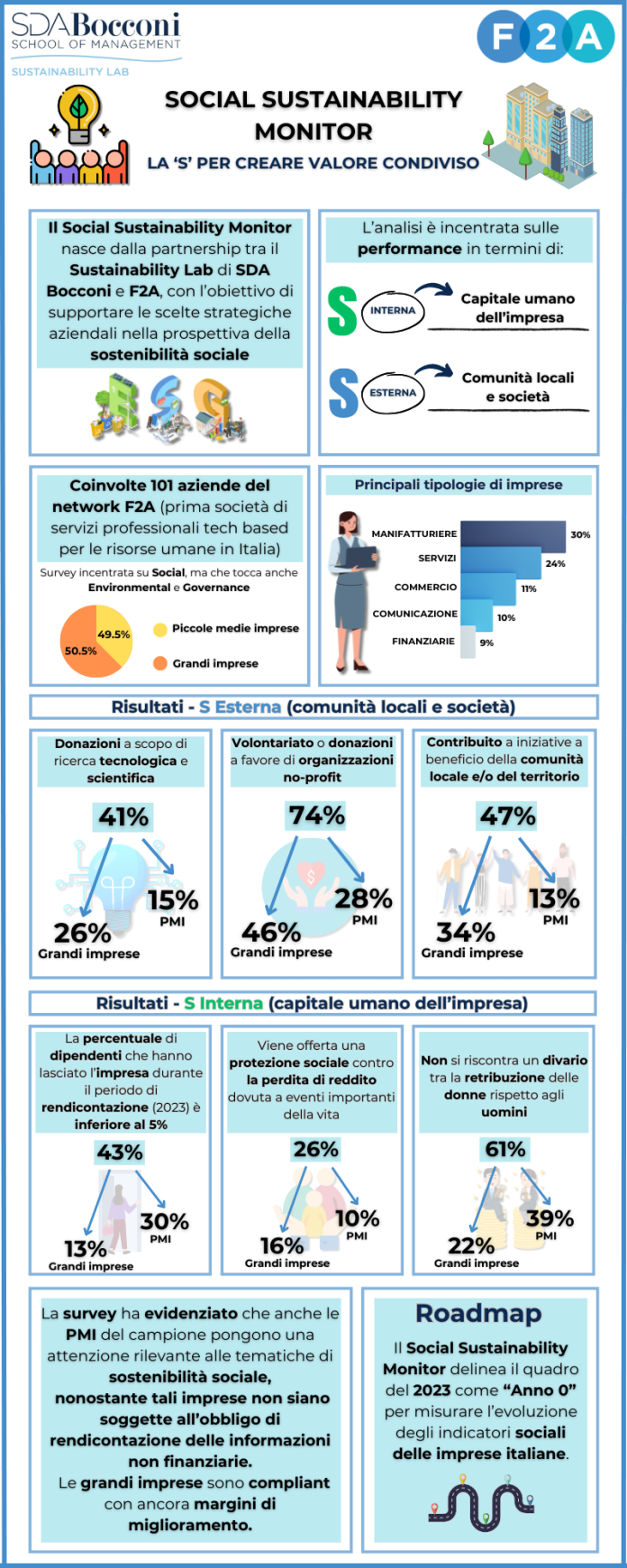 Social Sustainability Monitor è una nuova realtà nata dalla partnership tra il Sustainability Lab di SDA Bocconi School of Management, un think tank multidisciplinare che effettua attività di ricerca nella sfida della sostenibilità, e F2A, prima società di servizi professionali tech based per le risorse umane in Italia che ha di recente ottenuto la certificazione Parità di Genere, con l’obiettivo di porsi come strumento di studio e ricerca continua al fine di supportare costantemente le scelte strategiche aziendali e manageriali nella prospettiva della sostenibilità sociale.