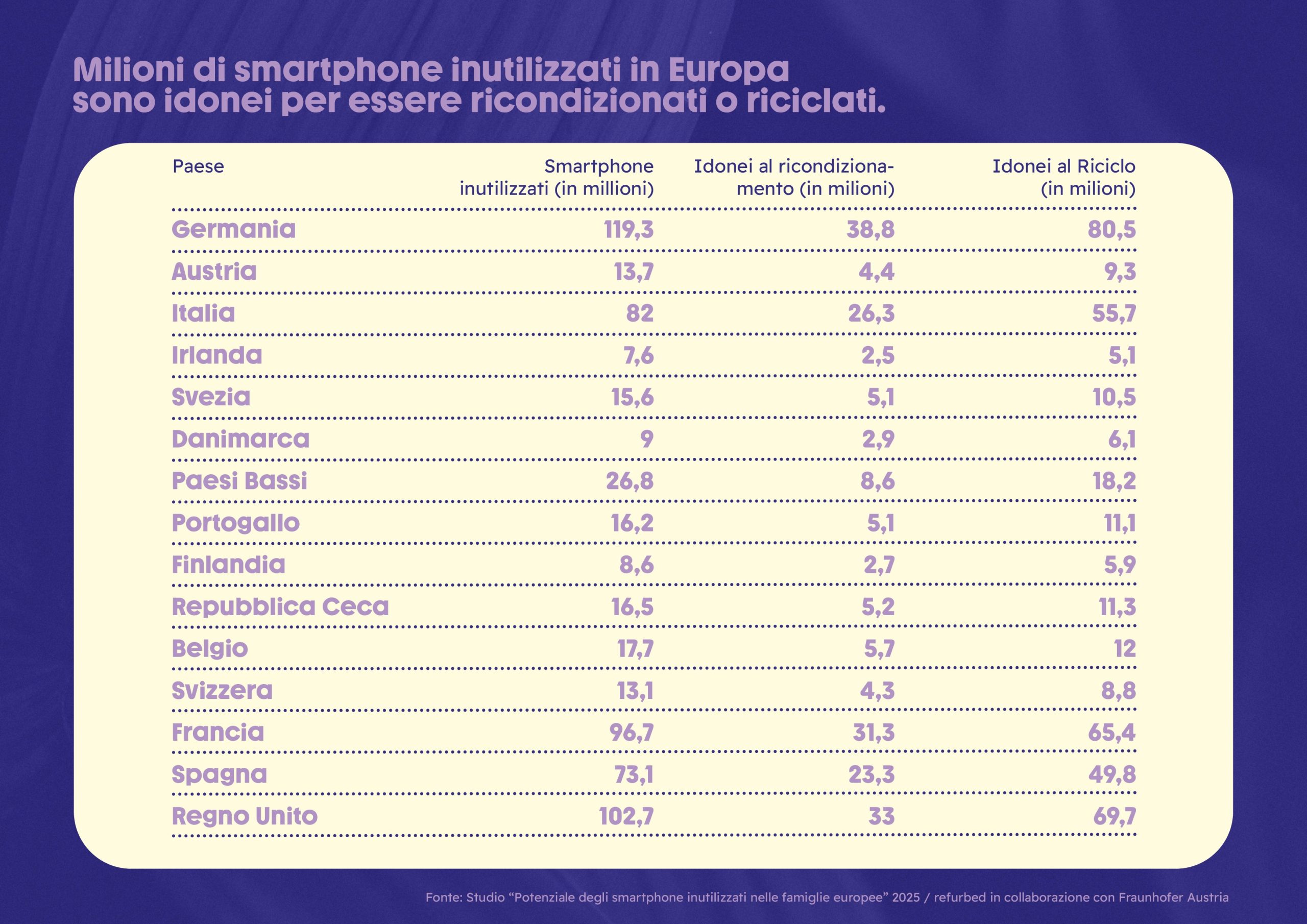 Nei cassetti delle case europee dorme un tesoro dimenticato: circa 642 milioni di vecchi smartphone sono infatti inutilizzati. Di questi, solo 211 milioni sono ancora adatti al ricondizionamento, mentre i restanti 431 milioni non lo sono, ma contengono materie prime per un valore complessivo di circa 1,1 miliardi di euro. Solo in Italia questo significa circa 55,7 milioni di telefoni riciclabili, capaci di restituire al ciclo produttivo tonnellate di materiali ad altissimo valore economico e strategico. Lo rivela uno studio realizzato da Fraunhofer Austria su incarico di refurbed, pubblicato a maggio 2025. Recuperare questi materiali preziosi significherebbe non solo ridurre la dipendenza dell’Unione Europea dalle importazioni, ma anche dare una spinta decisiva all’economia circolare.