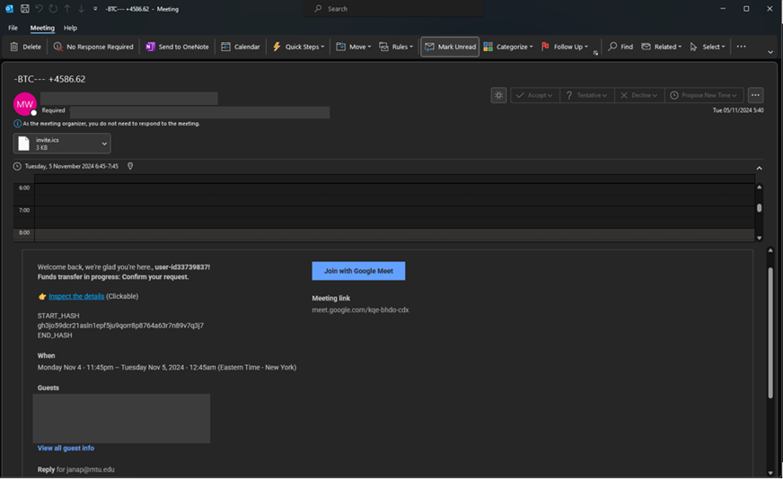 L’attacco di phishing mostrato di seguito è iniziato con un invito a Google Calendar. Alcune delle e-mail sembrano davvero notifiche del Calendar, mentre altre utilizzano un formato personalizzato: