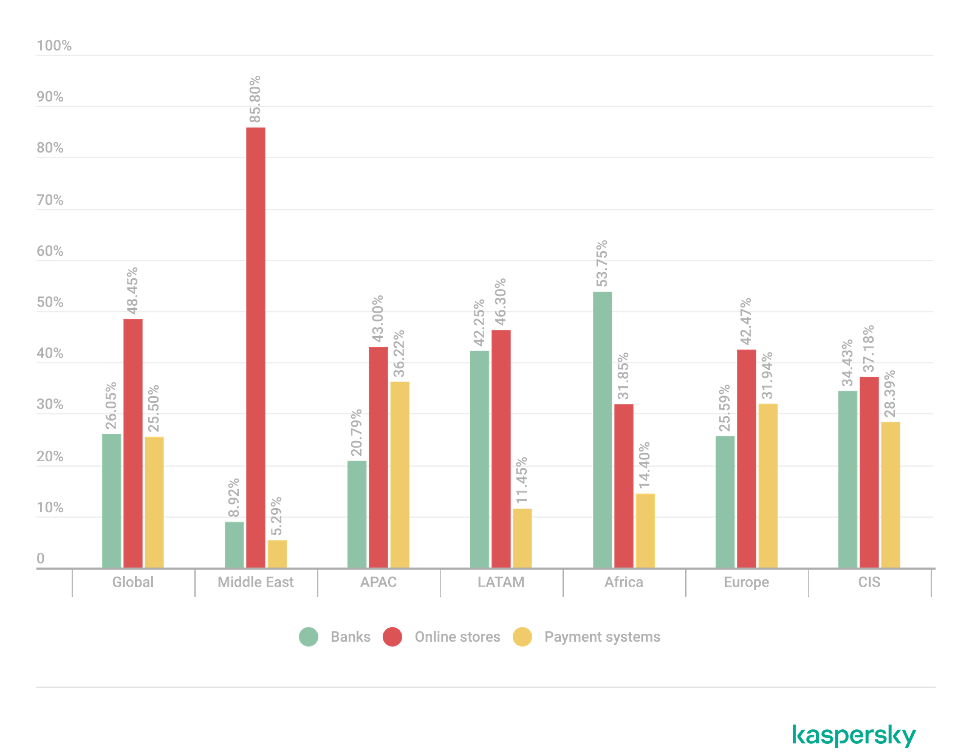 Gli attaccanti stanno inoltre adattando le proprie campagne alle abitudini digitali regionali. In Medio Oriente, il phishing finanziario è fortemente concentrato sull’e-commerce (85,8%), segno di una forte dipendenza da esche legate alla vendita online. In Africa, invece, prevale il phishing bancario (53,75%), suggerendo possibili lacune nella sicurezza degli account. L’America Latina presenta una distribuzione più equilibrata, con una maggiore incidenza sia dell’e-commerce (46,3%) sia degli attacchi alle banche (42,25%). In Asia-Pacifico e in Europa, invece, si osserva una distribuzione più uniforme tra tutte e tre le categorie, indice di strategie di attacco diversificate.