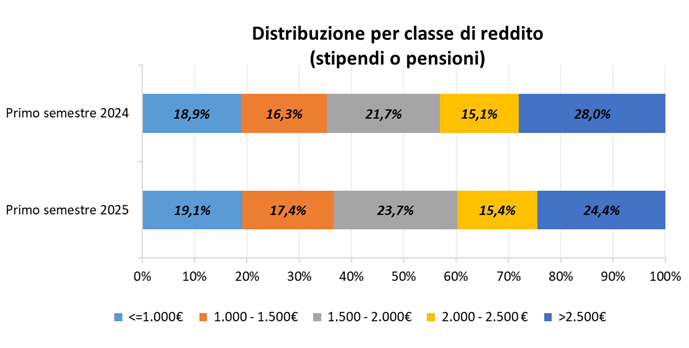 In relazione alla distribuzione del reddito percepito dai soggetti che hanno connesso il proprio conto, nel primo semestre 2025 si confermano le evidenze emerse nel pari periodo dell’anno precedente. La differenza maggiore si rileva nella fascia di reddito maggiore (>2.500€), che vede diminuire la quota di utenti di quasi 4 p.p. Parallelamente aumentano leggermente le persone con fasce di reddito inferiori, in particolare quelle di 1.000-1.500€ e 1.500€-2.000€, segnando rispettivamente un +1,1 e +2 punti percentuali. Questo può collegarsi anche all’aumento, visto in precedenza, di persone di età più giovane che aderiscono a servizi di Open Banking, in coerenza con la maggiore competenza tecnologica.