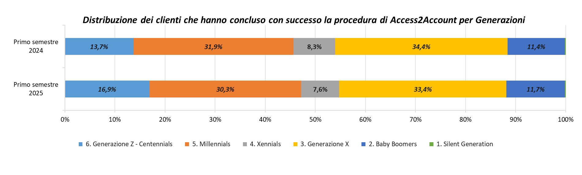 Analizzando la distribuzione per generazioni degli utenti italiani che hanno connesso con successo un proprio conto corrente, nel primo semestre 2025 si nota un aumento dei soggetti più giovani appartenenti alla «Generazione Z» (+3,2 punti percentuali) rispetto al pari periodo dell’anno precedente. Segno leggermente positivo anche per i «Baby Boomers» (+0,3 punti percentuali) mentre calano le quote percentuali delle altre fasce d’età.