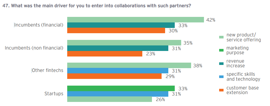 Con l’obiettivo primario di sviluppare nuovi prodotti e servizi, il 90% delle startup fintech ha avviato una collaborazione con altri player del settore finanziario a partire dal 2021. Nello specifico, il 65% del campione ha collaborato con una banca o una compagnia assicurativa, mentre il 58% con altre fintech. Inoltre, il 41% delle aziende intervistate ha iniziato a collaborare con altre startup non finanziarie, mentre solo il 25% con player incumbent di diversi settori come utilities, grande distribuzione ed entertainment. Nel complesso, il livello di soddisfazione per le collaborazioni è relativamente alto, con un punteggio medio di 7,5 su 10. Tuttavia, la collaborazione si è rivelata spesso complessa con difficoltà legate perlopiù all’integrazione di processi e tecnologie o alle trattative contrattuali.