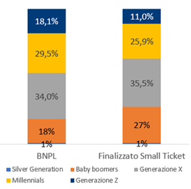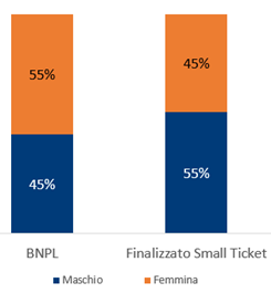 Inoltre, nel panorama del credito al consumo, il BNPL si distingue per una composizione di utenza unica nel suo genere. Secondo le ultime analisi, infatti, il prodotto BNPL registra una significativa prevalenza di utenti di genere femminile, con il 55% delle richieste provenienti da donne, rispetto al 45% degli uomini. Questo dato rappresenta un elemento distintivo rispetto alle altre categorie di finanziamento attualmente presenti sul mercato italiano. In particolare, il segmento del credito finalizzato Small Ticket mostra un’evidenza opposta, con una maggiore presenza maschile (55%) rispetto a quella femminile (45%), confermando il posizionamento peculiare del BNPL e la sua capacità di intercettare target demografici differenti.
