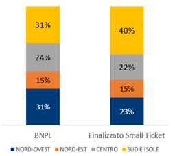 A livello geografico, si evidenzia una minore incidenza dell’erogato BNPL nelle regioni del Sud-Italia (31% BNPL vs 40% dello Small Ticket), e Nord-Ovest (31% BNPL vs 23% dello Small Ticket), a fronte di una minore incidenza nel Centro (24% BNPL vs 22% dello Small Ticket). Similari invece le quote nel Nord-Est (15% per entrambe le tipologie).